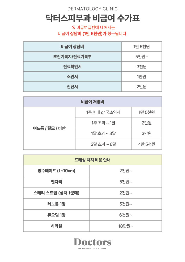 닥터스피부과 비급여 수가표 (지점별 상이)